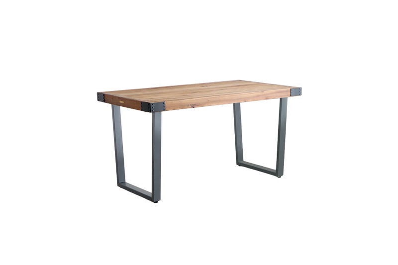 古材の風合いを最大限に活かしつつ、無骨なアイアンパーツで補強した、まさにワークデスクのような佇まい。
